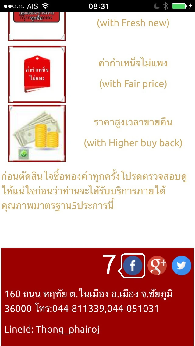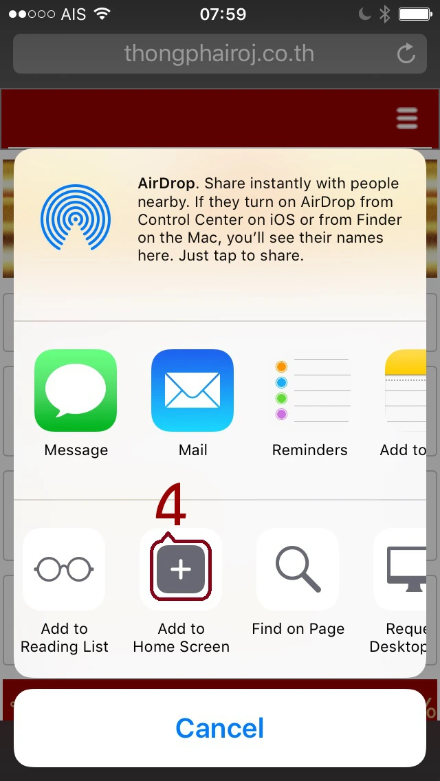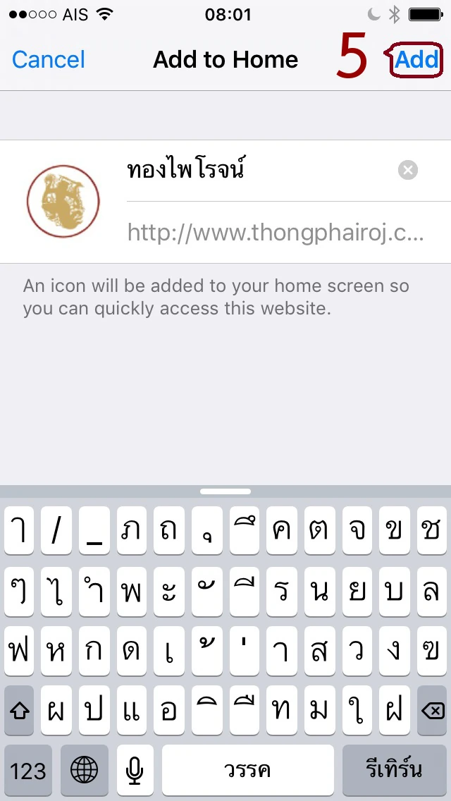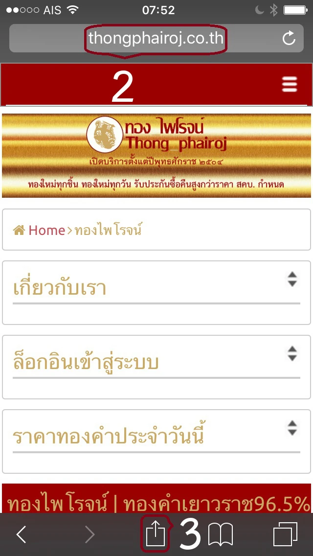 1. กดหมายเลข1(โปรแกรมเว็บเบราเซอร์ Safari ของไอโฟน) ตามรูปภาพที่-1 2. พิมพ์ www.thongphairoj.shop ลงในช่องหมายเลข2ที่มีข้อความว่า "Search or enter website name" ของ เว็บเบราเซอร์ ตามรูปภาพที่-2 3. กดปุ่มตามหมายเลขที่-3 ตามรูปภาพที่-2 4. กดปุ่มตามหมายเลขที่-4 "Add to Home Screen" ตามรูปภาพที่-3 5. กดปุ่มตามหมายเลขที่-5 "Add" ตามรูปภาพที่-4 6. ไอคอนทองไพโรจน์จะปรากฏขึ้นที่บนหน้าจอ(โฮมสกรีน)สมาร์ทโฟนของท่านตามรูปภาพที่-5 หลังจากนี้คุณสามารถเข้าถึงหน้าเว็บไซต์ของทองไพโรจน์ได้โดยกดที่ไอคอนนี้โดยไม่ต้องพิมพ์ www.thongphairoj.shop ในช่อง URL ของเว็บเบราเซอร์ อีกต่อไป 7.กดไอคอนทองไพโรจน์เพื่อเข้าสู่เว็บไซต์ แล้วกดปุ่มตามหมายเลขที่-7ไอคอนเฟสบุ๊คมุมล่างด้านขวาเพื่อติดตามข้อมูลข่าวสารของเราผ่านทางแฟนเพ็จทองไพโรจน์,หรือ เลือกกดเมนูราคาทองคำประจำวันนี้ เพื่อตรวจสอบราคาทองคำแท่ง96.5% ณ ปัจจุบันก็ได้